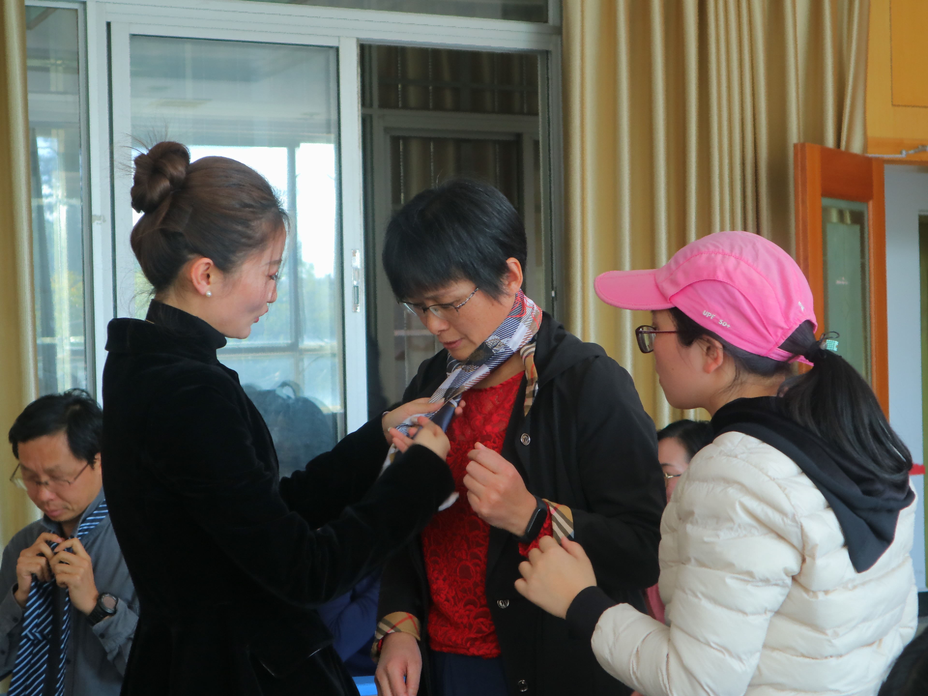 教研活动安排了三个寓教于乐的特色主题分享环节,包括女士日常化妆程序、丝巾系法及男士领带经典系法。中航联盟教育投资有限公司的何婧洁就日常护肤及化妆程序给大家做了介绍,陆玉珠和赵玉琪给大家分享了丝巾的多种系法,周鑫老师分享了男士亚伯拉王子结、温莎结、四手结等领带经典系法。主题贴近生活、内容丰富、精彩纷呈,参会教师都积极参与了分享活动。