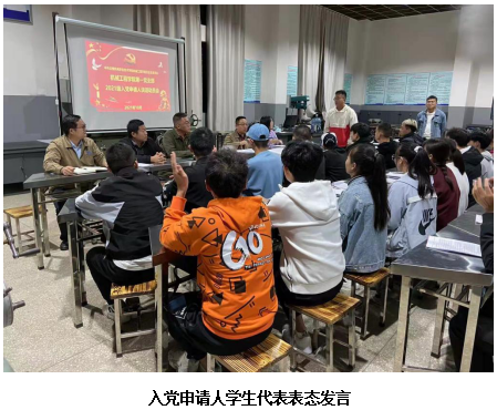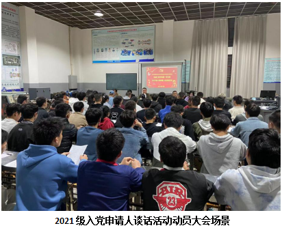 谈话正式开展前召开了“2021级入党申请人谈话活动动员大会”,党支部书记何亮作动员讲话,要求同学们端正入党动机,认真对待此次谈话环节,严肃对待25个党员发展步骤的每一步,争取做到早日从思想上入党。组织委员刘栋,宣传委员温成卓,党小组组长李德权分别做动员讲话,详细介绍了党员发展的25个步骤,要求同学们按照共产党员的标准规范自己的言行,努力创造条件,争取早日入党。入党申请人代表何阳同学怀着激动的心情在大会上作表态发言,将个人入党动机、对党的认识向组织汇报,决心以此为契机,在大学三年里乃至将来都会用共产党员的标准严格要求自己,努力学习,全心全意为人民服务,接受各位老师、同学们和党组织的监督和考验。