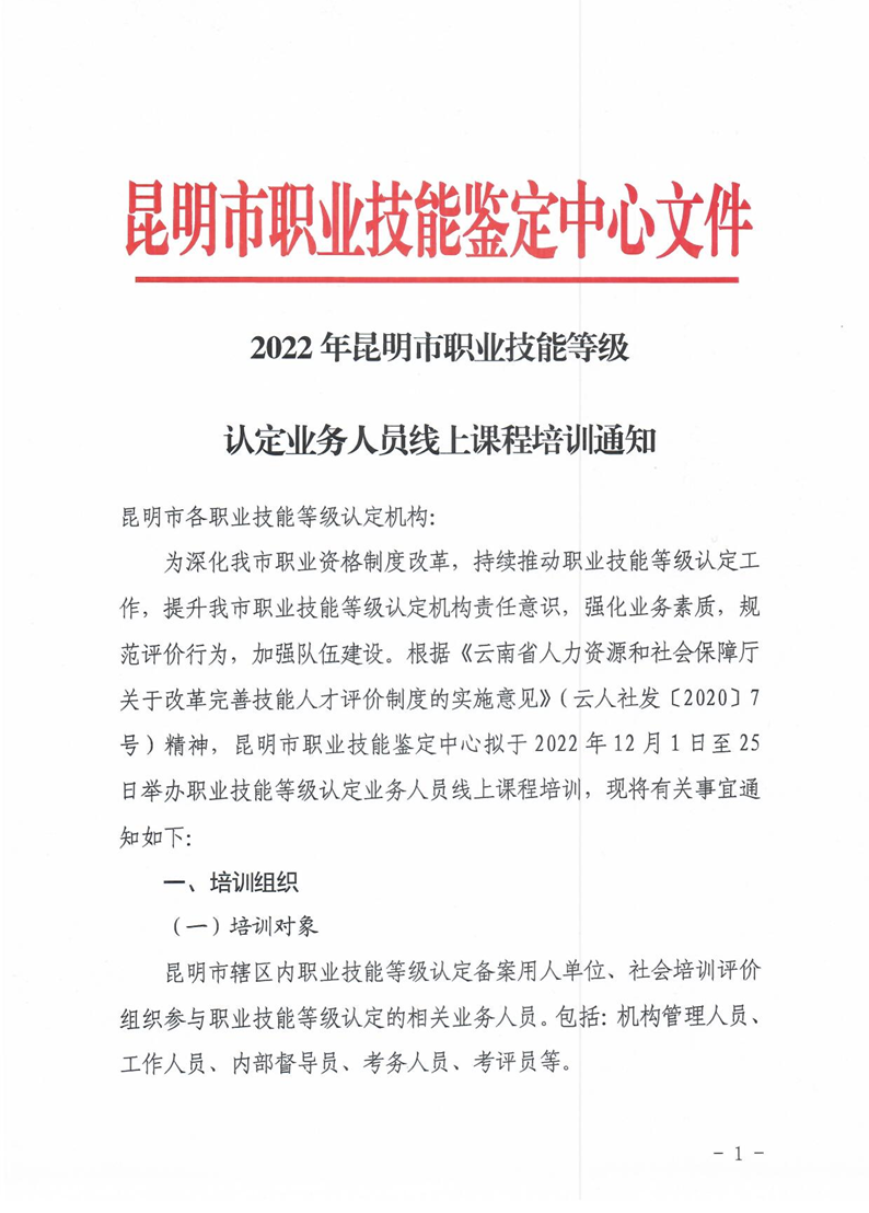2022年昆明市职业技能等级认定业务人员线上课程培训通知