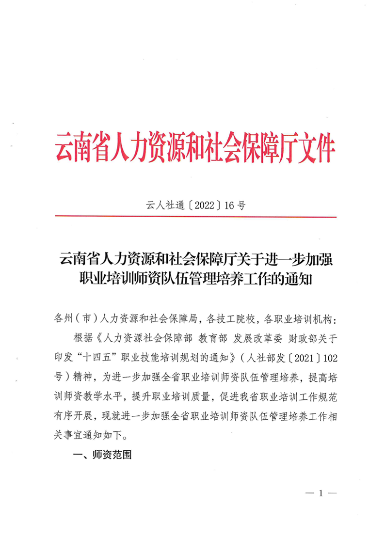 云人社通2022 16号 关于进一步加强职业培训师资队伍管理培养工作的通知(2) 来源: 发布时间:2022-12-12 11:04:58 浏览次数: 次 【字体:小 大】 终审:姚忠 分享到: 【打印正文】