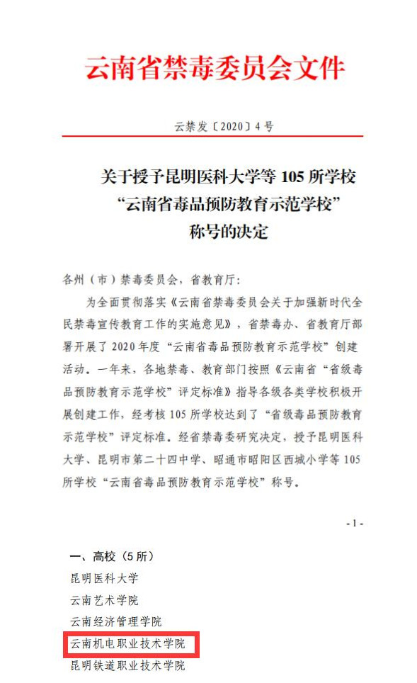 2020年12月31日,云南省禁毒委下发《关于授予昆明医科大学等105所学校“云南省毒品预防教育示范学校”称号的决定》(云禁发 [2018年]3号),米兰平台客服荣获“云南省毒品预防教育示范学校”称号。