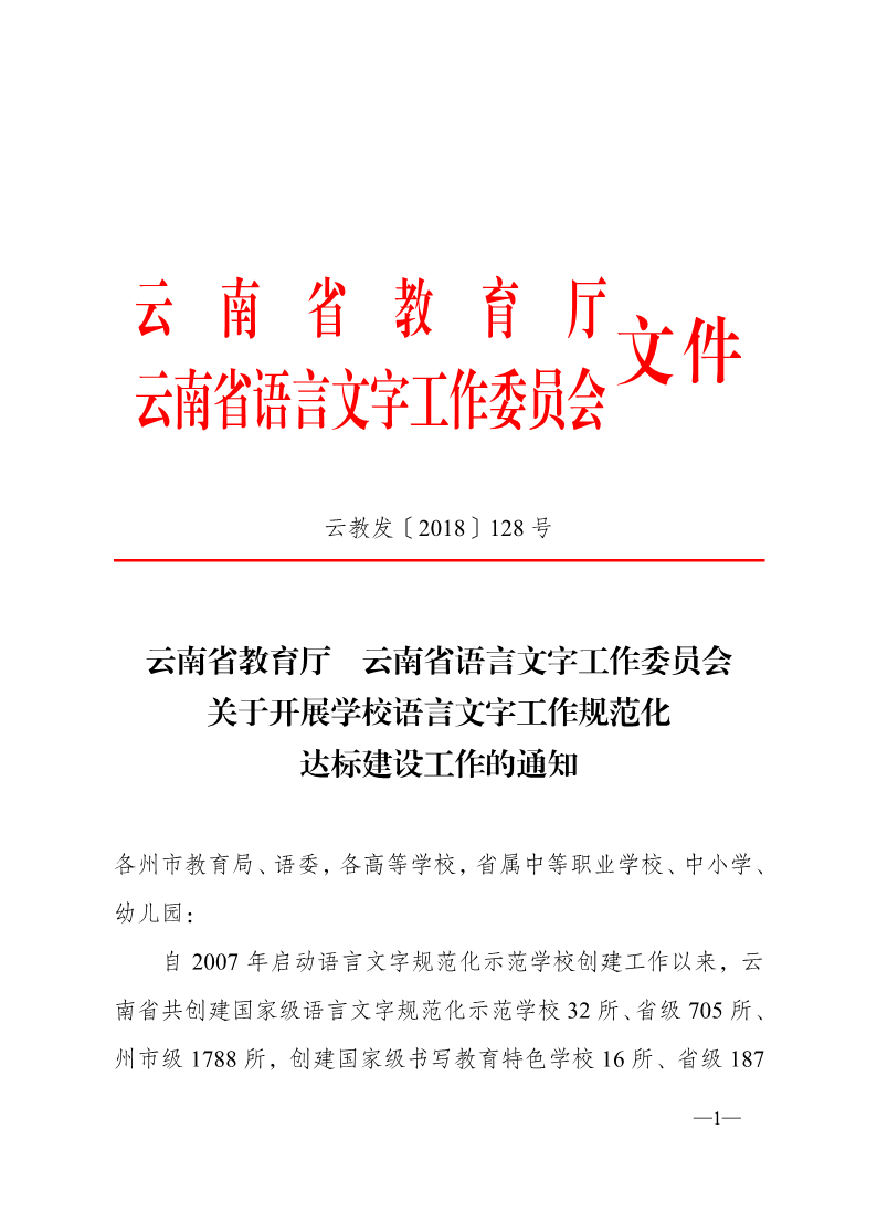 云南省教育厅 云南省语言文字工作委员会关于开展学校语言文字规范化达标建设工作的通知 来源: 发布时间:2025-01-20 17:52:42 浏览次数: 次 【字体:小 大】 终审:王福才 分享到: 【打印正文】