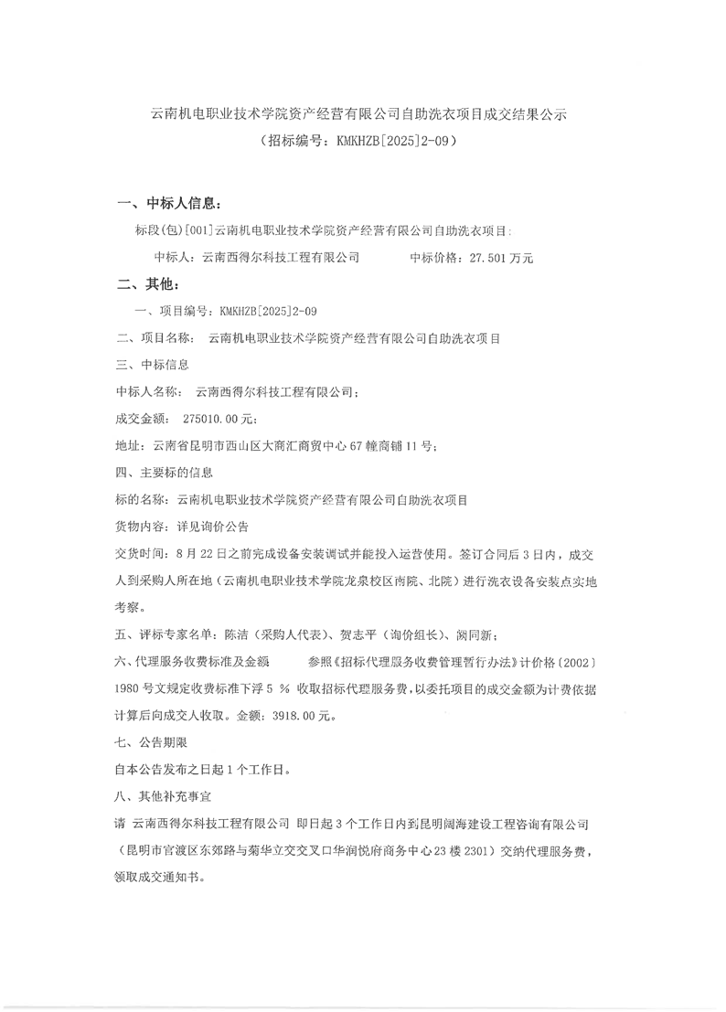 米兰平台客服资产经营有限公司自助洗衣项目成交结果公示