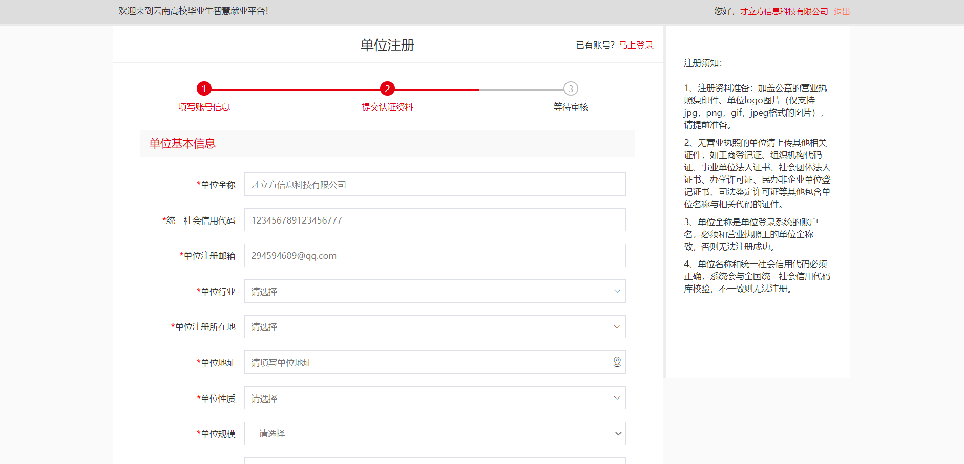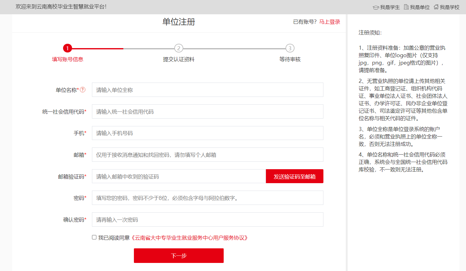 打开注册第一步,按右侧提示完成单位注册,如图:
