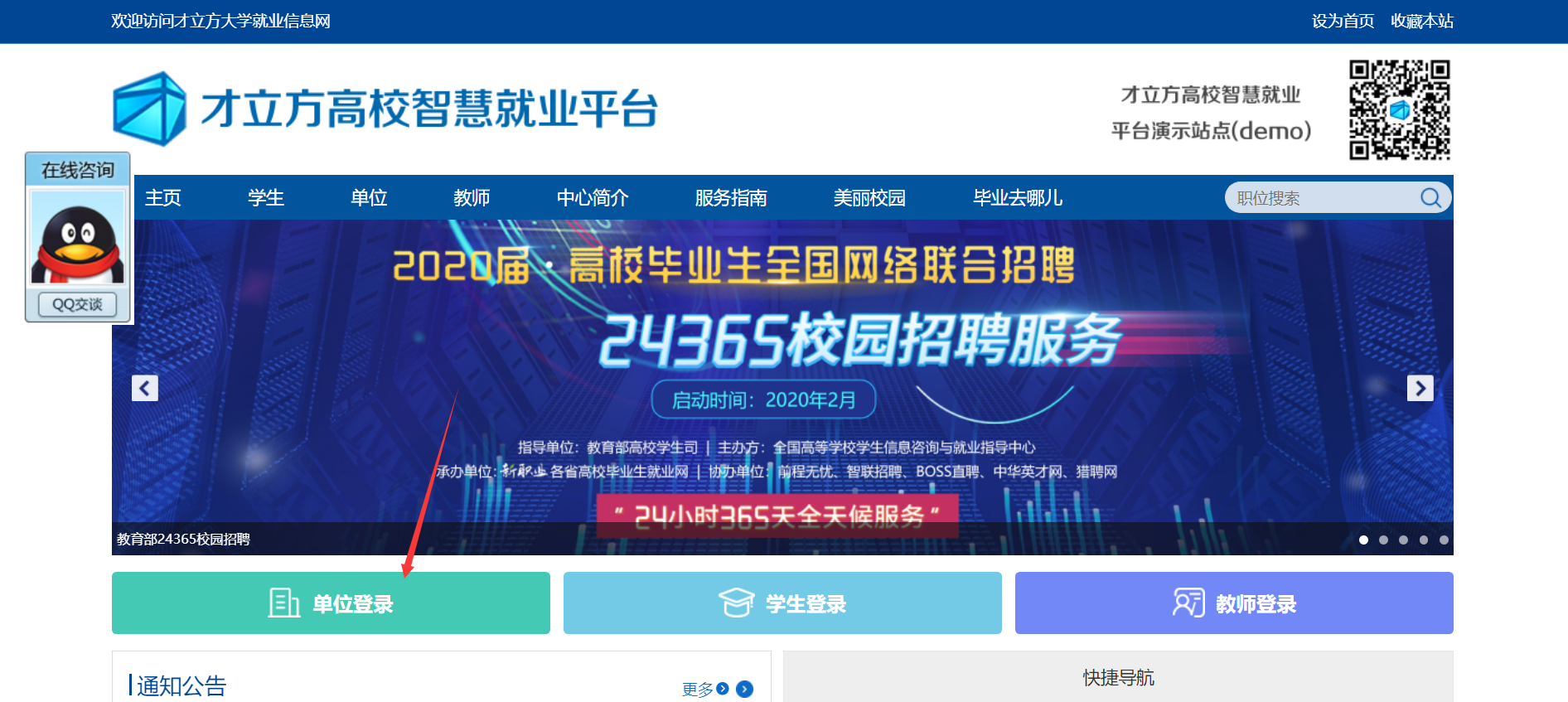 打开学校就业网网站,选择单位登录,如图: