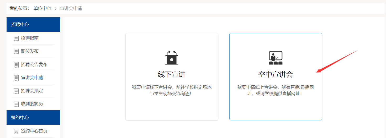 单位到我校申请空中宣讲会(招聘会),需要先到云南高校智慧就业平台进行注册,然后选择入驻我校,我校审核通过后,单位即可登录我校就业网,申请空中宣讲会。