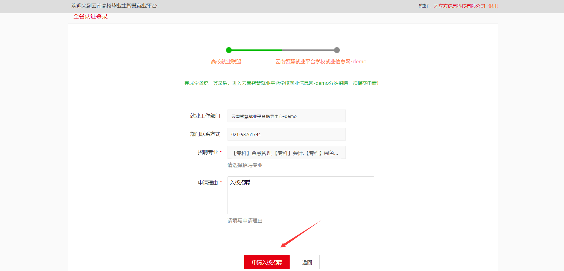 按实际情况填写完成,点击【申请入校招聘】,如图: